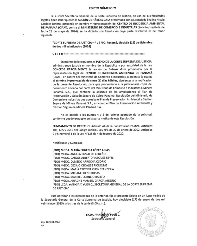 Desde mayo de 2024 solicitamos acceso a esta información para conocer las medidas previstas para la gestión del sitio tras el fallo de la Corte Suprema de Justicia de Panamá del 27 de noviembre de 2023, que declaró inconstitucional el contrato de concesión minera. Según el procedimiento establecido por la propia entidad, este plan debía regir las acciones orientadas a garantizar la estabilidad física y química del área luego del cese de operaciones.